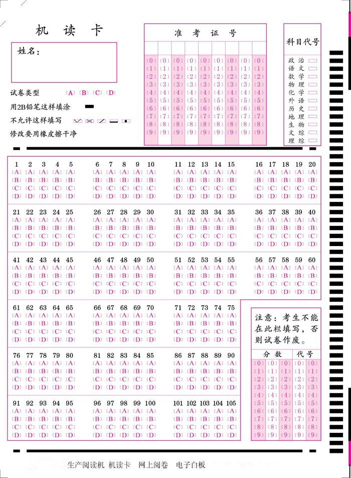 光標閱讀機對信息卡上的所有被閱讀部分的定位精度要求較高,所以制作一張答題卡有很多要求。它要求所用紙張纖維要長,紙張薄厚均勻,挺括程度好、施膠度較高、光滑度好、漲縮均勻,且漲縮較小,以及印刷的套印和基準邊的裁切精度較高。只有滿足上述條件,閱讀機在閱讀答題卡時不會因造紙原料差和施膠度低產生掉渣、掉粉現象而擋住光電頭,造成閱讀錯誤,不會因紙張薄厚不均,挺度、光滑度差,在連續閱讀時產生大量雙張、卡紙等現象,不會因紙張漲縮太大或印刷、裁切精度低使閱讀點定位不準,而讀不到或讀錯。