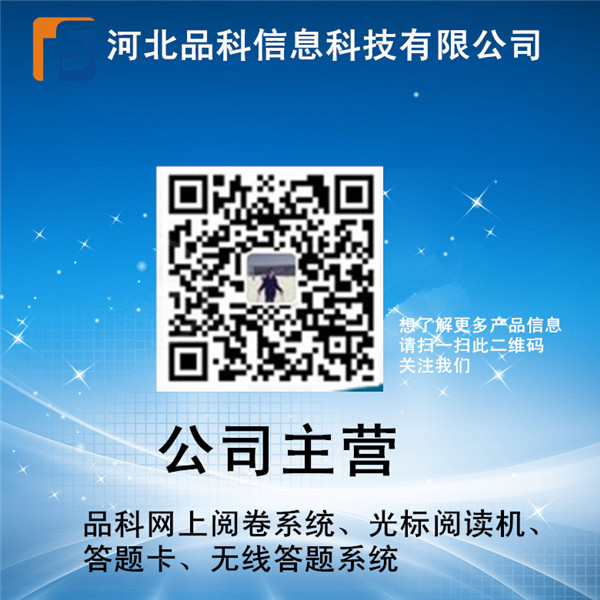 品科信息科技有限公司,是集生產、研發和銷售為一體的高科技企業,目前主要從事光標閱讀機(簡稱OMR:Optical Mark Reader)、網上閱卷及其相關產品(機讀卡、軟件)的開發生產和銷售。 公司自成立以來,依托雄厚的技術實力和研發背景,一直致力于自有知識產權軟硬件的產品的研制和開發,在數據處理產品領域(OMR)推出了一系列具有國內外水平的產品,已擁有三個系列的光標閱機產品,為廣大用戶提供而完善的解決方案,可靠而安全的系統集成,而周到的技術服務,應用范圍覆蓋了教育、郵電、通訊、金融、證券、稅務、統計等諸多領域,產品遠銷海內外多個和地區。